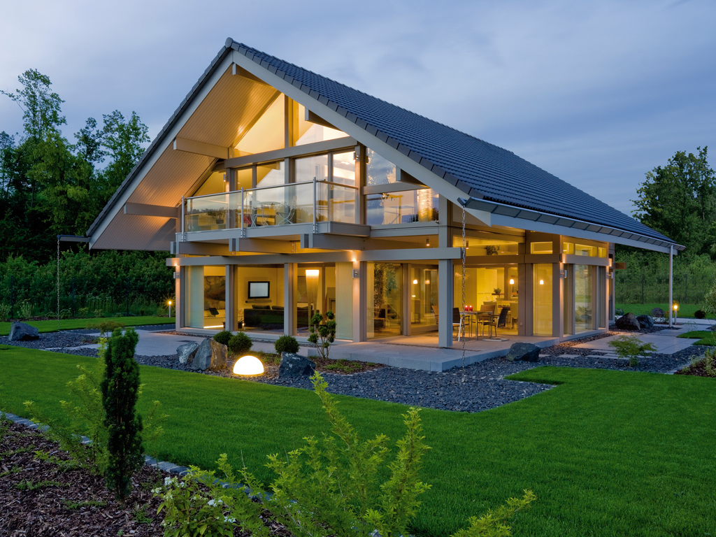 These pictures belong to one of the houses built by the Huf Haus company. Huf Haus is a german company that manufactures prefabricated houses, a mix of timber and glass, with windows on all sides. They are modern, light and airy, and the interior is open-plan, designed to the owner's specifications. These houses are easier to build than traditional ones and are actually not so expensive like other luxury houses, besides the fact that they're built to a high standard and are extremely energy efficient.